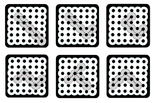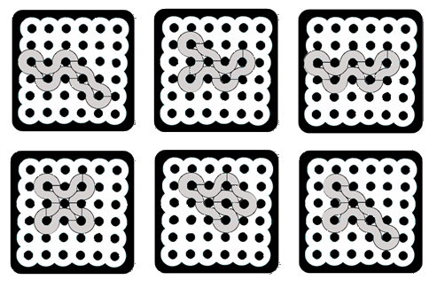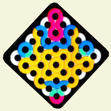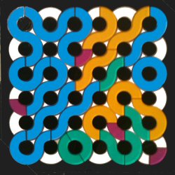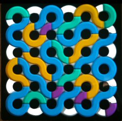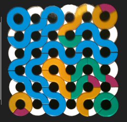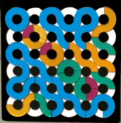 Here are some special solutions found by Yonah Borns-Weil, whose homeschool library includes a large supply of our gamepuzzles. Check these out, from left to right: a) the quads form a single snake, with 4 O's in the corners; b) a diagonal row of 5 O's; c) maximum color separation; d) 5 loops and full symmetry.
