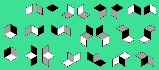 The tiles consist of all the shapes of one, two or three diamonds that can be overlaid on a tiling of stars and hexagon rings. Oddly enough, that produces the 23 pieces above, for a total of 57 unit rhombs that exactly cover the classic Diamond Star pattern. Fitting the tiles together can create the optical illusion of a field of two-color stars, framed by the third color. Each pair of colors occurs white/gray, white/black, and gray/black. The frame of one becomes the arms of another star.