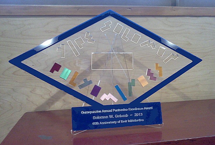 | Here's a photo of Solomon Golomb's "Polyominoes" award, assembled like a puzzle with its own stand and plaque. The 11 puzzle pieces consist of 6 pentominoes and 5 hexominoes, a total of 60 squares, and present solving challenges for 3 rectangles and a search for congruent shapes to form with the pentominoes versus hexominoes. |