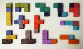 In 2005, Kadon established a special annual award to be presented to the individual or organization that created the best new pentomino or polyomino idea of the year. Each award is a unique custom design. For the year 2014, the award went to a mysteriously named Italian designer, "LordMinimal Impossible", for an ingeniously made set of "DoubleEntendre" pentominoes. When formed correctly into a 6x10 rectangles, the 12 pentominoes display a secondary solution painted on top where each pentomino has a different color. Thus each actual pentomino carries multiple colors that are matched up in groups of five to form a virtual rectangle. Here are LordMinimal's pieces: