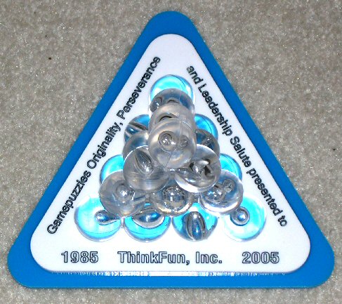 As part of its own 25th celebration in 2005, Kadon created this special industry award — the Gamepuzzles Originality, Perseverance and Leadership Salute — to be presented to another game company on a notable occasion, in recognition of extraordinary merit. We were proud to present the first one to ThinkFun, Inc. (a Binary Arts company), and to its hard-working co-founders, Bill Ritchie and Andrea Barthello, for 20 years (1985-2005) of outstanding work in producing and marketing consistently excellent and mind-challenging games. Their products have won over 200 awards. It's time they themselves were honored. We salute them! The puzzle stacked on the engraved base is our Perplexing Pyramid, consisting of 20 spheres formed into 6 tricky pieces that assemble only one way to form a tetrahedron. We can just imagine this toy on Bill Ritchie's desk as a reminder of how much perseverance it takes to succeed at the puzzle of business and of life.