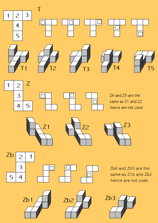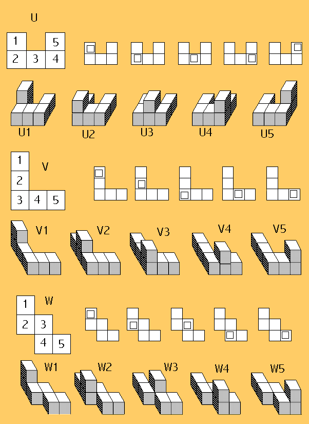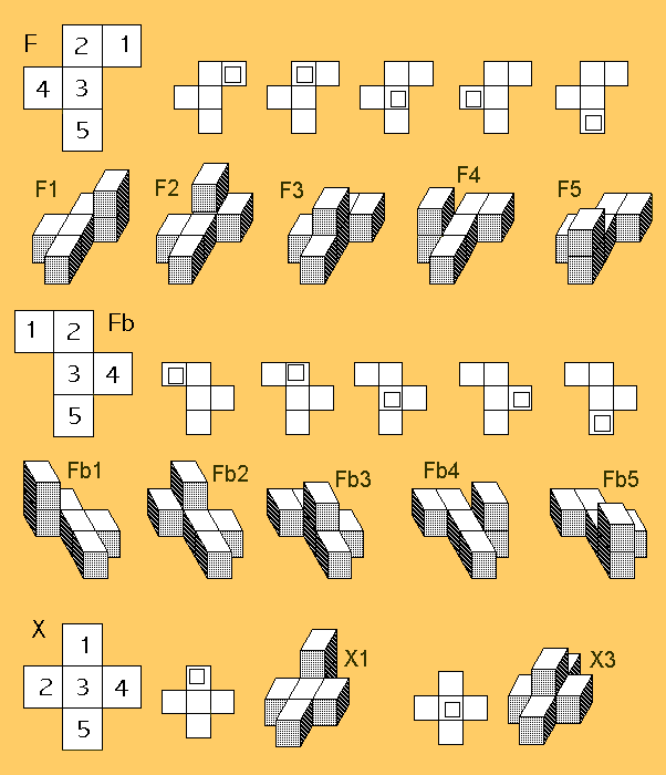 Group 2 cross-section of 5 cubes To turn a pentomino (flat pentacube) into a 3-D hexacube, we simply add one unit cube to the top and bottom of any of the 5 unit square faces of the pentomino. If the pentomino is symmetrical, it gets cubes added on only one side. Each square gets a number, from 1 through 5, reading from top to bottom of the way the piece is viewed. The X pentomino has only two distinct cube placements, and the I pentomino is not in this group at all, because no matter where we attach the cubelet, all six cubes still make a single cross-section. The Z pentomino gets only 3 on each side, because through rotational symmetry two cubes become identical with the ones at the other end of the piece. The name of a piece is then the pentomino letter plus the number of the covered cube face. For reversible pieces, the back of the piece is designated with its letter plus b, followed by the unit cube number. The numbers back each other up, being the same down through to the other side.