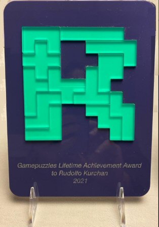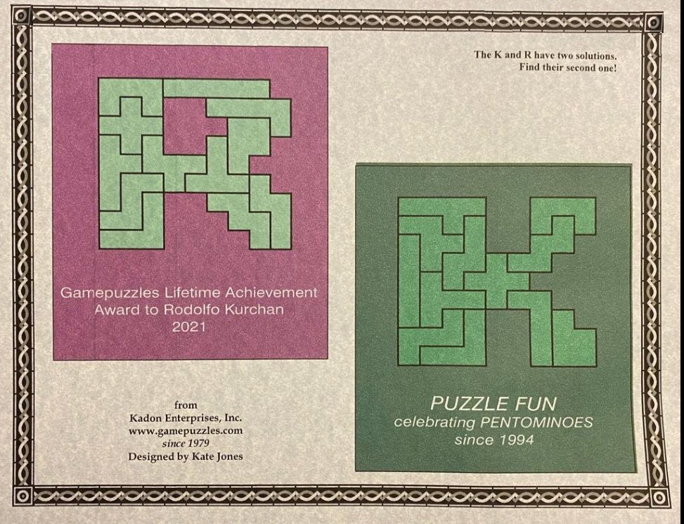 In 2021, Kadon created the first lifetime achievement award and presented it to Rodolfo Kurchan of Argentina in 2022, for his more than 25 years of research and celebration of pentominoes. A certificate and formal cover letter accompanied two framed acrylic puzzles based on the pentomino letters R and K:
