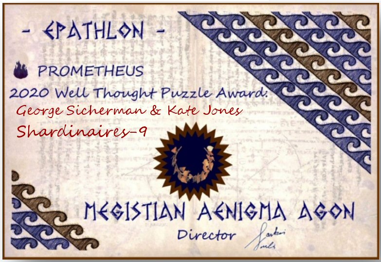 The 4th Annual Megistian Aenigma Agon puzzle competition was held on the Greek island of Kastellorizo, June 26-28, 2020, organized by Pantazis Houlis, an internationally well-known Greek puzzle designer and collector. The competition was in four categories: Interaction, Inscription, Illusion and Invention. The word Megistian comes from one of the island's names (Megisti), Aenigma means puzzle, and Agon stands for competition (agony?). It is a celebration of toys and word-games for children from 0 to 150 years old, presenting to the world Greece's leading role in puzzles. One of our winning entries was our Shardinaires-9 set, created by George Sicherman and awarded the Prometheus prize in the "Well-Thought" puzzle category.