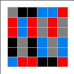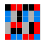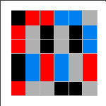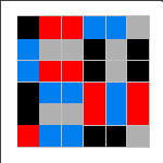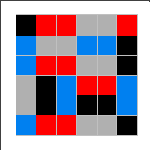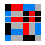 An elusive challenge for MiniMatch-II is the 16-dominoes problem. Arrange the tiles so that the little color squares occur in connected pairs, except for the four single corners. Joseph Konrad provided several of the solutions shown; Tory Davis, Ariela Perlman, Nachum Spinner (age 9), and Kate Jones also found solutions. It is not known how many solutions exist. Notice the pattern of which colors must be in the corners. If you find a solution not included above, please send us a drawing of it and we'll send you a little prize, as well as add yours to this group.
