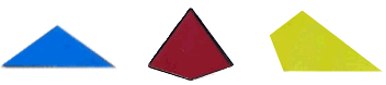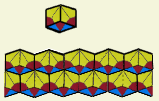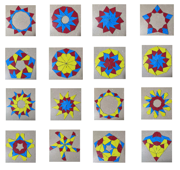 This project was initiated by Tick Wang, a puzzle enthusiast from Shanghai, in 2023, as an addendum to our pentagon-based family of sets. Tick explored tilings with ten copies each of just three shapes, each in its own color. Left to right: golden-ratio triangle (blue), kite (red), long kite (yellow) .