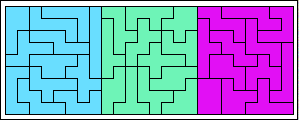 The solutions below were sent to us by Jack Wetterer, associate professor of physics at the US Air Force Academy and a big fan of polyomino and polycube sets. Professor Wetterer liked the way we package Heptominoes as a three-part rectangle and worked out a couple of three-rectangle divisions for Sextillions. Notice that the middle ones have a hole that's the shape of one of the pieces.