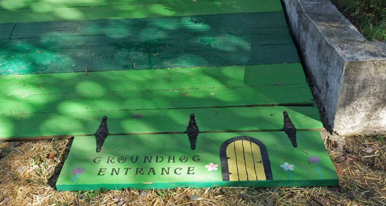 At the end of our entrance ramp, lately painted a cheerful green, a groundhog had dug an entrance to his tunnel that runs under the entire booth. No matter how often management tried to fill it with concrete, the determined fellow dug it out again. We finally decided to give him his permanent entrance and only close it off during show hours with a hinged gate, nicely painted by Sue Bare: