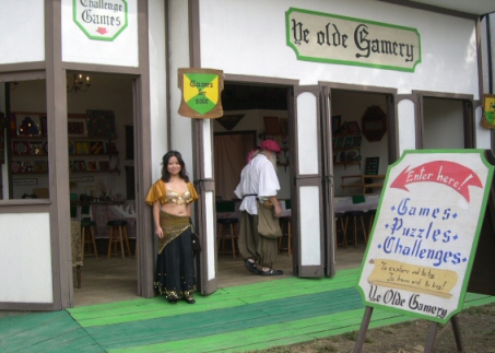 Mistress Katrina, the proprietress, is seen here in her Renaissance regalia, with bodice laced, ready for visitors to test their wits on the puzzles. |