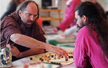 A visitor concentrates deeply as he matches wits with the Gamery's resident mathematician and instructor, Elijah Allen (at right), in a game of The Power of Two. Dick Jones is part of the Saturday crew. He's especially good with the kids who eagerly come in to try the puzzles.