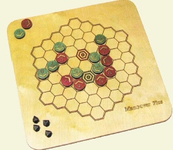 We introduced Manoover on a board of 37 hexagonal spaces in one of our past Buyer's Guides (December 2007 GAMES). Designer Kate Jones, prompted by a request for something even more appealing to strategists, has not only created more challenges for two on a larger board, but added on the other side Bob Abbott's exacting battle for three.