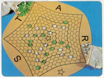 Players alternately place a marble of their color on a vacant space. Play ends when all spaces are filled or (with experienced players) when both contestants agree that no further useful plays are possible. Gain one point if you own three or more of the five corner spaces. For each connected group of two or more stones in your color, score one point for each perimeter space they occupy and one point for each vacant perimeter space they surround. If one player has more connected groups than the other, subtract the lower number of groups from the higher number. The player with fewer groups adds twice the difference to his score, and the opponent deducts this amount. (In the original Star, the amount added and subtracted was simply the difference in the number of groups, making connection of different groups only half as valuable.) The player with the higher score wins.