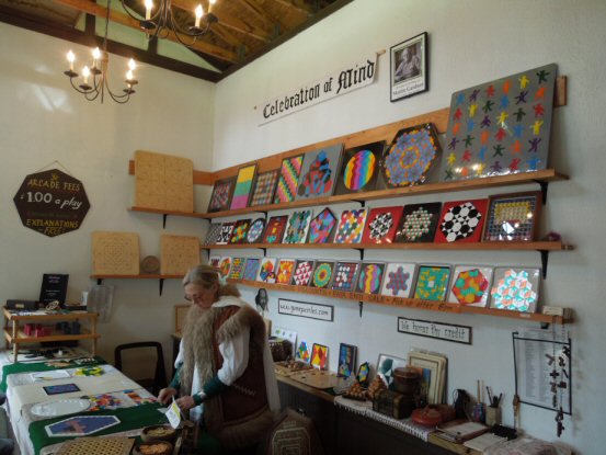 As we like to say as often as possible, Ye Olde Gamery represents the intellectual side of the Renaissance an oasis of thinking, logic, math, geometric tilings, the fun of discovery and solving of beautiful conundrums. All day long, large crowds of visitors engaged in eager play, instructed by the Gamery's well-costumed expert crew. We particularly enjoy watching our youngest players deep in thought. Many audience members arrived in costume, as the Renaissance Festival is not only a historical theme park but a massive role-playing game in its own right. Here are some snapshots of the action inside the Gamery, captured by Art Blumberg. (Hover over images for descriptions.)