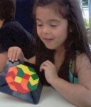 ![]() Here are just a few of the symmetrical patterns that you can make with the Rombix Jr. set. Some have the colors grouped, some have the colors totally separated. They all have "rotational" symmetry. To get a swirly pattern, you can put either the four squares or the four chevrons or the four "boots" clustered in the center and work around them. There are hundreds more designs you can create with this little set, such as landscapes, animals, figures, as your imagination will suggest. Here's a delightful pattern found by an adorable young visitor to our booth in Key Biscayne, FL, in 2013. She was clearly delighted with it, too: