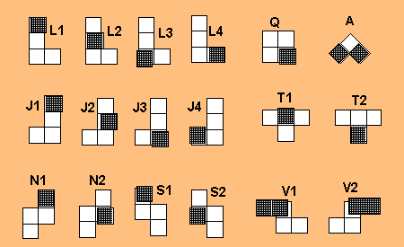 The 18 superquint pieces (17 unique and one duplicate) are all the shapes of five cubes joined on their faces in three dimensions. Here are their names, patterned after the alphabet system of the original 12 quints. Notice that a letter represents the largest cross-section of the piece, and a number represents the position of the cubelet attached on the upper level (shown dark in the drawing).