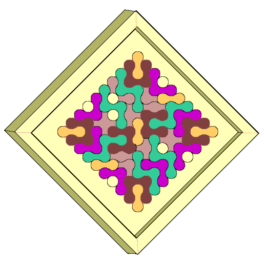 | If you'd like to hang this set on a wall, a single nail or hanger will support it in the diagonal position shown above. The clear cover keeps the pieces in and the dust out. This is how we've hung the deluxe Super Roundominoes at Kadon headquarters. |