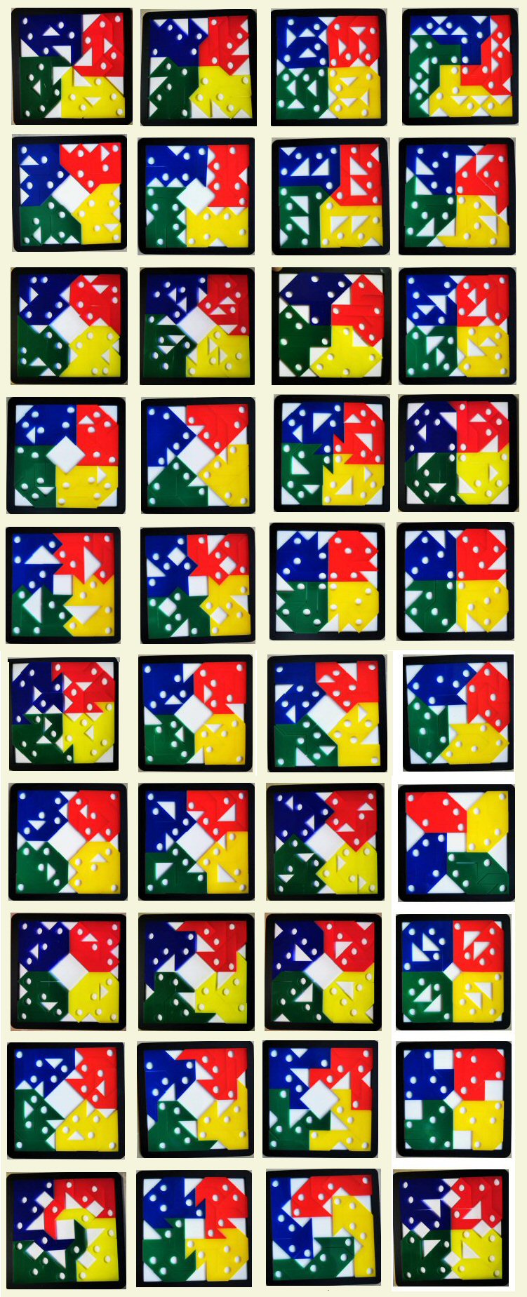 Here we show his huge collection of mirror and rotational symmetries for your visual pleasure. They start with 2 pieces of each color, then 3, 4, and all 5. See not only the interesting shapes the tiles will make but also the variety of spaces around them, including triangles, squares, parallelograms, trapezoids, stars, and even octagons. Isn't it amazing how many variations just 5 shapes can make, and even their symmetrical solutions can be rotated or exchanged to form even more permutations of a simple arrangement? Here is the wonder of mathematics formed into playable art. Enjoy the tour.