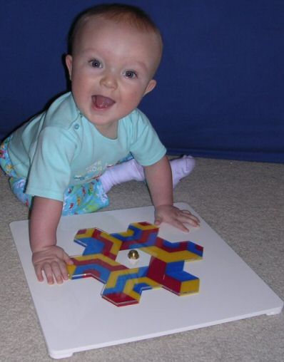 October 2007: While their roof was being reshingled, everything on the walls had to be taken down. In baby Daniel's nursery, decorated with colorful puzzles and pictures, our Hexmozaix is usually admired only from afar by the eager little explorer. His mom sent us a photo of this rare moment when he could get a closer look. It will be a few short years yet before he's ready to play with it for real, and in the meantime the beauty of the set adds to Daniel's stimulating environment. Wise mom. We're thrilled to watch this young mind growing.