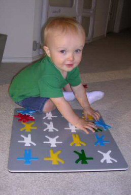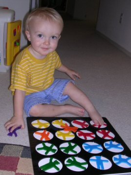 February 2009: At almost two years of age, Daniel has caught on to fitting the bears by shape into their cut-outs, a much more demanding task. And he's got the hang of turning them over when necessary. We're happy his mom keeps a camera close at hand to capture these special learning moments.