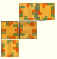 The other sides of the 5 squares display partial pentominoes which, when correctly joined, show complete pentominoes across all joined edges. Advanced solvers will not have any duplicate shapes, and the P-pentomino will show a panorama of all 12 pentominoes.