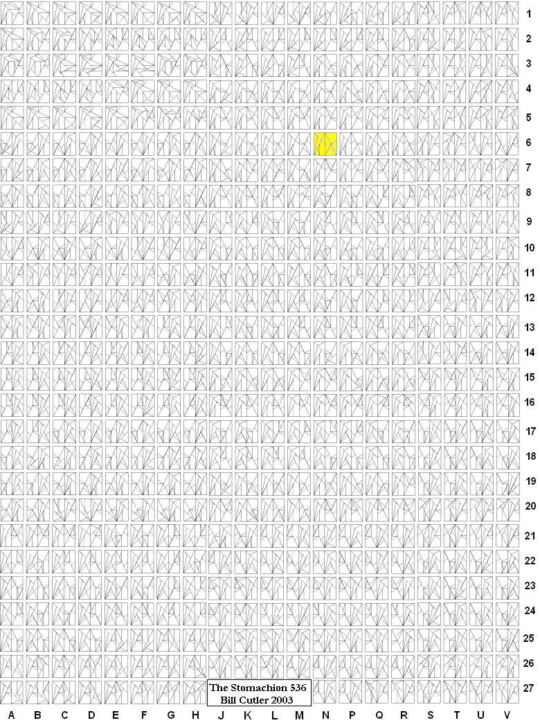 These are all 536 solutions of Archimedes' Square, as identified by Bill Cutler on October 31, 2003. This neat layout, courtesy of Joe Marasco, fits on a single sheet of paper. The highlighted solution at N6 is the standard one usually seen, and the way we package it and the one to which we assigned the 3 colors. This chart lets you compare any solution you've found, to verify that it already exists. Remember, rotations and reflections are not counted as different. Because "536" can be read as May 36, that's five days past May 31, Joe Marasco has proposed that June 5 be declared as Archimedes Day and celebrated annually in honor of the man who gave us not only the Stomachion but a huge number of other mathematical inventions. We're happy to endorse this day of celebration. |