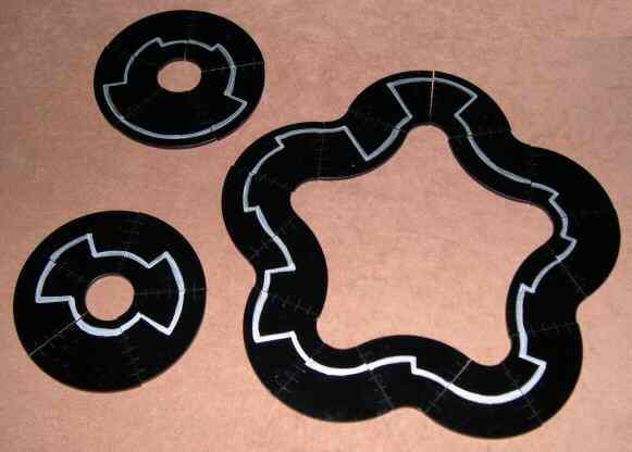 Here is a solution of two rings and a closed loop with 15 arcs, all matching their paths. See how the rings have symmetrical path patterns and contain one "double" tile each. Double tiles have an arc that connects the same level 1-1, 2-2, 3-3, 4-4 and 5-5. All the other tiles step up or down between different levels. See also how on the larger loop the arcs turn in and out, so that converse edges meet 1 to 5, 2 to 4 while 3 meets 3 either way. That's a valuable hint for solving, saving the 3's to the last.
