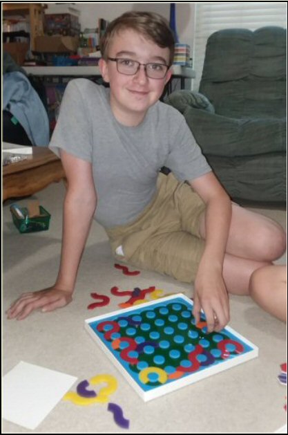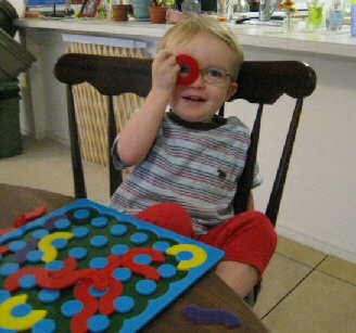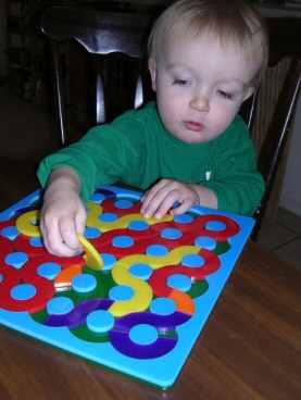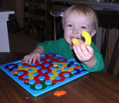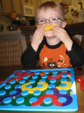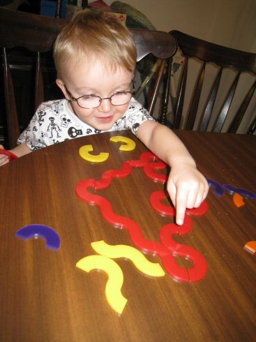 May 2009: His mom reports: "According to Daniel the best pieces of ChooChooLoops are still the O, C's and S's, but he did try some of the larger 'squiggles.' Daniel spent a good bit of play time taking out pieces he had already placed and moving them to other parts of the board. He puts such concentration into doing that, so it must be important to him. He is definitely making progress on placing the bigger pieces." And having pure fun:
