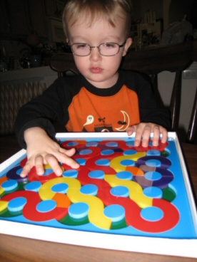 October 2009: Building free-form and tracing the tracks. Mom reports: "A fun new idea we are investigating are mazes/labyrinths, so we spent time setting up continuous loops and having Daniel trace them with his finger. We compare lengths of loops and try to connect the same colors to follow paths (off board). Fun!"