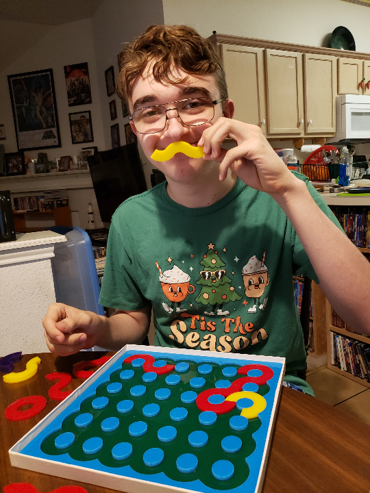 June 2024: Mustache revisited, Daniel, age 17, clowns around while searching out advanced challenges with their jumbo ChooChooLoops set, a family favorite for 15 years.