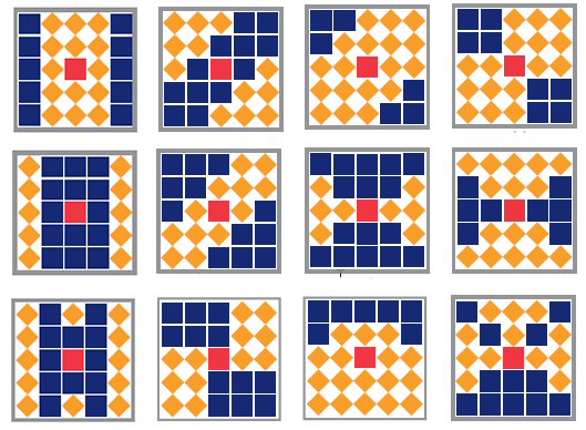 Below are some of the figures mixing diamonds and squares, a small sampling of the variations in the Doris book. Notice the neat symmetries. They all have many solutions.