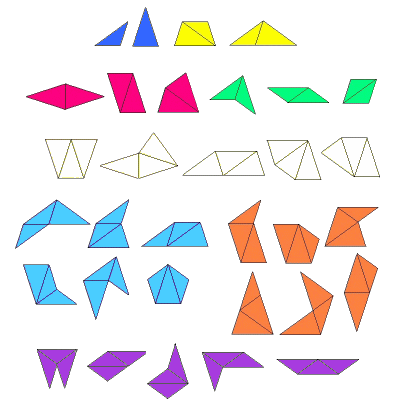 These tiles come from dissecting a pentagon, and they share the pentagon's golden-ratio and non-periodic characteristics. The lengths of their sides are related by the golden ratio (an endless decimal beginning with 1.6180). They also occur within a tiling in a frequency that matches the golden ratio, with about 5/8 tall triangles and 3/8 the wide triangle. Note the difference between La Ora Stelo's building blocks and those in our Collidescape sets, wherein the sides of the two triangles are the matching length. These occur in the reverse ratio of 5/8 wide and 3/8 tall because their wide triangle is actually the size of two unit polyore triangles joined (the order-2 polyores triangle shown in the first row below). Jacques derived the polyores by combining the unit triangles in length-matched groupings from one to twos and threes. Here are all 32 shapes of polyores orders 1 through 3: