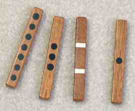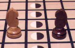 The 12 dark and 12 blond horses look like chess knights but gallop in straight lines. They move like knights in some of the solitaire puzzles, however. With sumptuous velvet carrybag. The Sidle version of Gallop uses the silky-smooth wooden stick dice shown below.