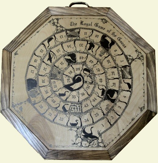 A lucky throw of 9 at the beginning of the spiral path advances a player to one of the fields with dice. Landing on any of the pretty geese doubles a player's move. An exact count on one or both dice is needed to reach the center goose, and if the number rolled is too great, the player has to take the surplus numbers in reverse. Landing on another player's space sends that player to where the new arrival began the turn. Could be backward or forward. Lots of laughs! You can get a lot more information and amazing historical notes on Peter Aleff's website about The Game of the Goose and the Phaistos Labyrinth. |