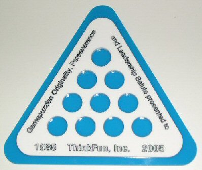 As part of its own 25th celebration in 2005, Kadon created this special industry award — the Gamepuzzles Originality, Perseverance and Leadership Salute — to be presented to another game company on a notable occasion, in recognition of extraordinary merit. We were proud to present the first one to ThinkFun, Inc. (a Binary Arts company), and to its hard-working co-founders, Bill Ritchie and Andrea Barthello, for 20 years (1985-2005) of outstanding work in producing and marketing consistently excellent and mind-challenging games. Their products have won over 200 awards. It's time they themselves were honored. We salute them! The puzzle stacked on the engraved base is our Perplexing Pyramid, consisting of 20 spheres formed into 6 tricky pieces that assemble only one way to form a tetrahedron. We can just imagine this toy on Bill Ritchie's desk as a reminder of how much perseverance it takes to succeed at the puzzle of business and of life.