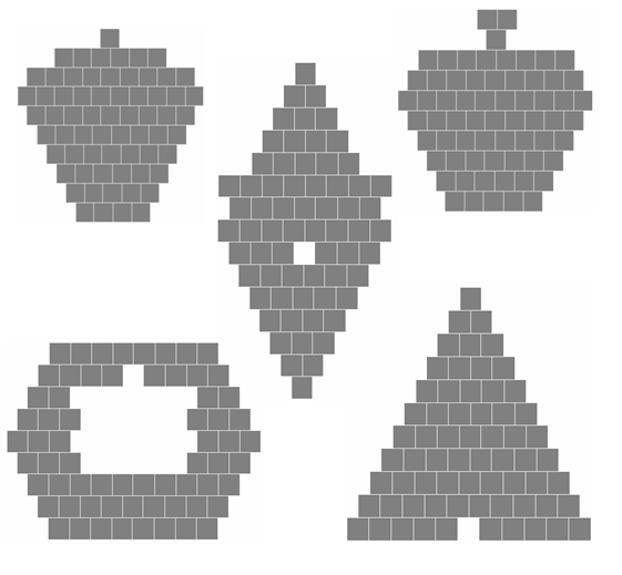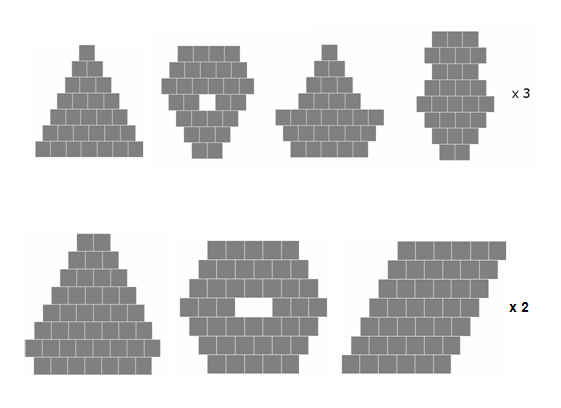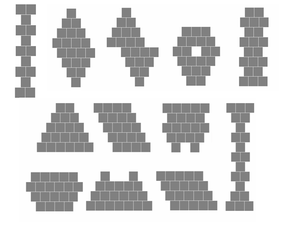 | All the figures shown below, and many more, are solvable with some or all of the polyhops tiles. From small, introductory figures to multiple copies of the same shape, challenges range from easy to extremely difficult. Hopscotch will definitely keep your mind hopping and invites your ingenuity in creating additional figures. Few things compare to the satisfaction when all the pieces fit. |