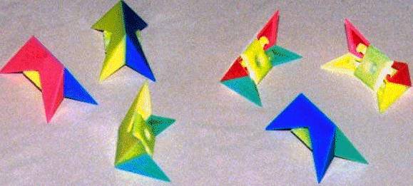 | Once you had the six pairs of wings fastened together with the "frogs," the fun began of trying to fit them together ultimately into a ball. Each pair shown here is also different in color, so one of the challenges was to have no two of the same color touching. More than one solution exists! |