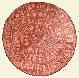 No agreement exists among scholars as to the exact meanings of all the hieroglyphs on the board. Enough of them are known or definable to establish the game structure and its inspiration of the Goose game, and Peter Aleff has developed the most detailed interpretation of it. It's fun to try to decipher others on your own. There are exquisite connections, side passages, celestial references, and profound symbolisms to make the game play enjoyable on many levels. Here is a view of a replica of the disk, showing the hieroglyphs on both sides, where they had been pressed into wet clay: