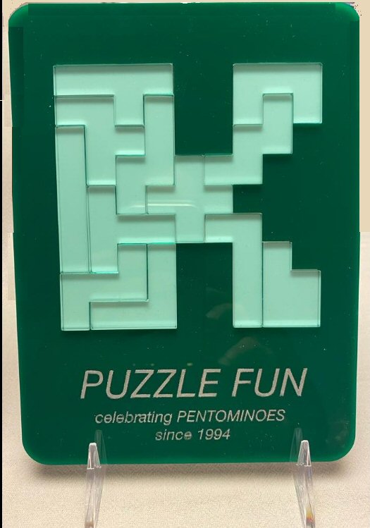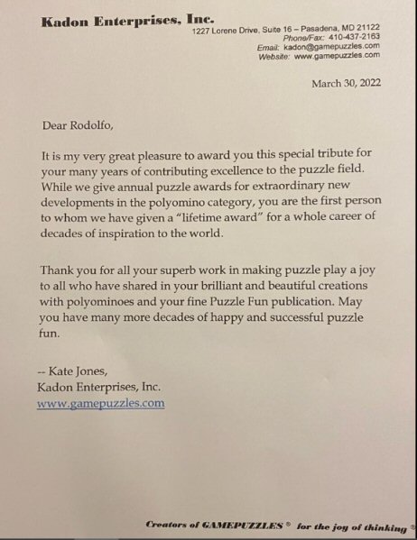 In 2021, Kadon created the first lifetime achievement award and presented it to Rodolfo Kurchan of Argentina in 2022, for his more than 25 years of research and celebration of pentominoes. A certificate and formal cover letter accompanied two framed acrylic puzzles based on the pentomino letters R and K: