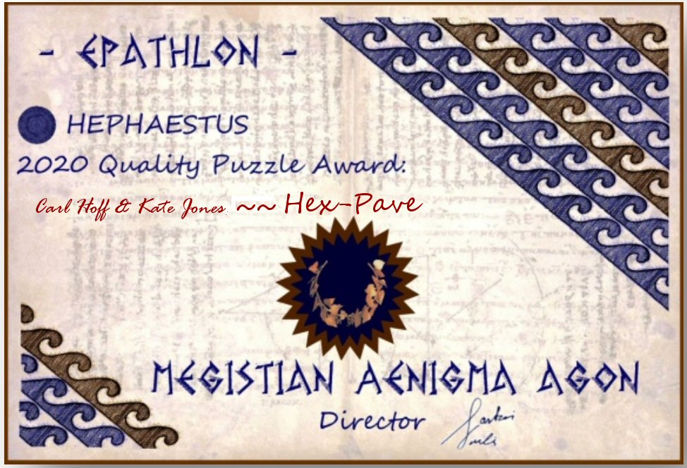 The 4th Annual Megistian Aenigma Agon puzzle competition was held on the Greek island of Kastellorizo, June 26-28, 2020, organized by Pantazis Houlis, an internationally well-known Greek puzzle designer and collector. The competition was in four categories: Interaction, Inscription, Illusion and Invention. The word Megistian comes from one of the island's names (Megisti), Aenigma means puzzle, and Agon stands for competition (agony?). It is a celebration of toys and word-games for children from 0 to 150 years old, presenting to the world Greece's leading role in puzzles. One of our winning entries was our complex and elegant Hex-Pave set, awarded the Silver medal in the Quality Puzzle category.