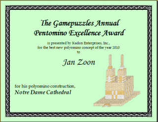 Jan Zoon had been playing with pentominoes since 1976, when he wrote his first solving program as part of a math assignment. He moved up to pentacubes in 1983. He kept updating his solving program, "Cube Syndrome", to handle ever larger polyominoes and larger-order polycubes, right on up to the octocubes.