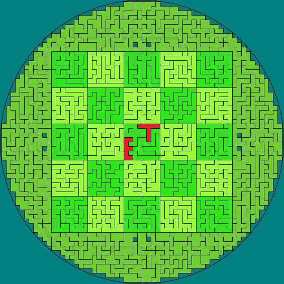 The solution below is by Michael Keller of Baltimore, forming all 369 octominoes into a single 51x58 rectangle. Notice his strategy for solving this monster: he used the complicated pieces first and saved the easy, more cooperative shapes to the last, where they are clustered in the lower left quadrant. The six unfillable holes are dotted with a contrasting color. Michael is one of the world's top polyform puzzlists and once self-published, for 16 years, an excellent magazine, WGR. WGR stood for World Game Review, but through a labyrinth of legalities he ended up losing the right to call it that and gave up publishing it altogether. The superb editorial contents may eventually be preserved online.