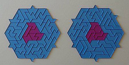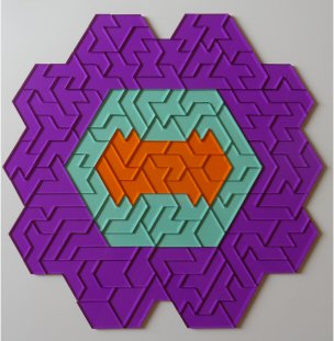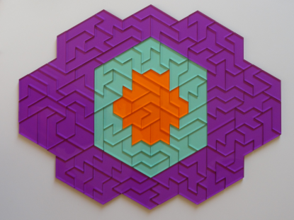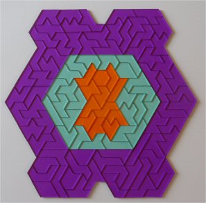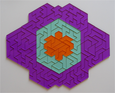 Here's a new look with new colors, with more complex external ring and novel hexiamond symmetry embedded in the central heptiamond hexagon. John Greening's variety of designs is always a surprise.
