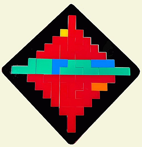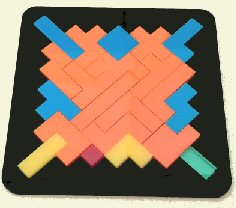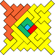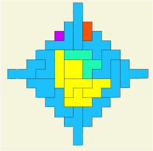 Two other tricky challenges were the tetromino center line (left, in blue) solved by Meshele Merchant, and the smaller pieces separated around the perimeter (right), by Eric Bare. It's interesting that these solutions were found for the first time after more than 25 years of our making this puzzle. There is no end...