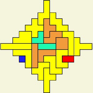 Another rare solution is to have the smallest pieces form a square in the center. Here is one example, though one orange corner is touching it.
