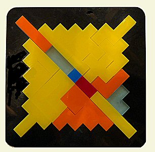 We always try to push the limits, to get the minimum or maximum arrangements that a puzzle set can yield. One question we were always curious to find: What is the maximum number of border spaces that can be filled in the Poly-5 tray with just the pentominoes? We knew it could not be 100%; there just aren't enough pieces to stretch the whole length. We'd gotten close with just two non-pentominoes helping to fill out the border. Then Sara Hopper, on September 15, 2011, in our pavilion at the Maryland Renaissance Festival, came up with this record-breaking beautyjust one outside piece. Hurray, Sara!