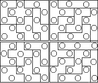 Alternatively, one can work through all the permutations within the various rectangular envelopes, or boundaries, that a number of units touches. (For example, the P pentomino takes up a 2x3 rectangle, the T hexomino needs a 3x4, and so on.) And each process must find and eliminate any duplicates that inevitably show up. So we find there are 5 distinct tetrominoes, 12 pentominoes, 35 hexominoes, 108 heptominoes, 369 octominoes and 1285 enneominoes. Spectacular solutions combining these large-order sets have been found by world-class puzzlers, such as Jack Wetterer and Karl Wilk. See a few of their mega-solutions here. Nick Maeder has produced a gallery of fabulous symmetry solutions with the 108 heptominoes. They'll take your breath away. Lyrically beautiful shapes, each arrangement is a work of art. By size 15, the total number of shapes tops 3 million. Such huge sets and their statistics are of only academic interest, not practical as hands-on recreations, and require computer assistance. Many search programs have been written to simplify finding counts and solutions. Here is an excellent one for both 2-D and 3-D solving by Aad van de Wetering (mostly in Dutch; scroll down to the English description and download). Joining cubes in three dimensions is an even more intricate process. The shapes can be rotated into 24 different positions, so duplicates are harder to spot. Four cubes make 8 different shapes, 5 cubes become 29 shapes, 6 cubes jump to 166, and 7 cubes produce 1023. David Goodger has one of the most extensive collections of pentacube figures and solutions on his website, Polyform Puzzler, beautifully displayed. David has also written sophisticated solver programs to track down solution counts. Bob Harris has investigated packing 4x4x4 cubes with combinations of 3 pentacubes/7 planar heptacubes and 3 each of 3 solid heptominoes ("tripling tripled heptacubes") with a monocube hole in every possible position.