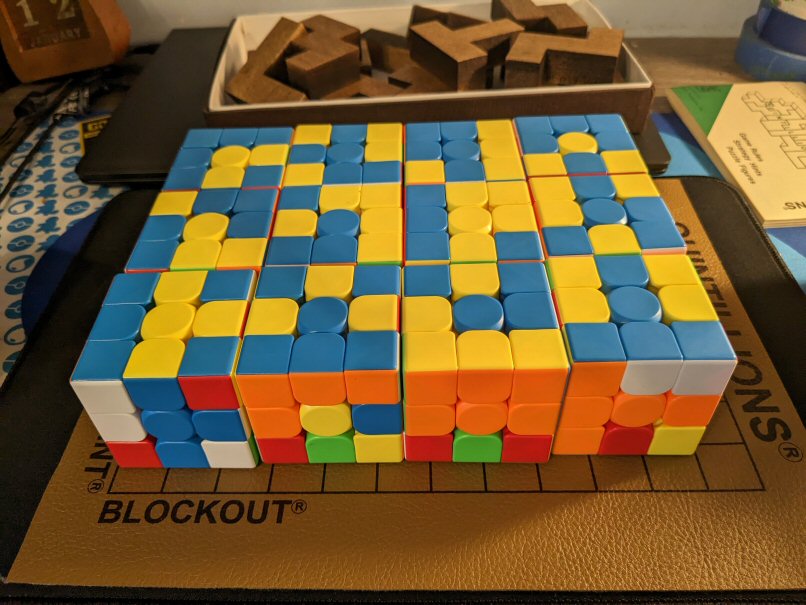 In January 2023, we received the most incredible embodiment yet of the 12 pentominoes as a Squint game, filling a 9x12 rectangle with a 3x4 array of... Rubik's Cubes! Sydney Weaver, a world-class speed cuber with many gold medals in her collection for solving a scrambled cube in under 8 seconds (yes, that is 8 seconds!), managed to first solve an array of the 12 pentominoes all fitting into the rectangle with only corners touching, and then solving the 12 cubes so that their assembled tops show that solution, the pentominoes in blue. Have a look and marvel at what one human mind can achieve. |