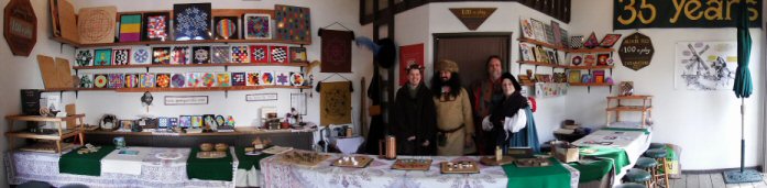 Hundreds of visitors came and played and heard the story of Martin and math and puzzles. Customers also received souvenir copies of the award-winning 40-page Renaissance catalog Kate had designed and written in Shakespearean verse to suit the Renaissance theme. They also received a special gift, a nicely illustrated fact sheet about Martin and our puzzles, highlighting some of our historical games. Copies of the time travel story were also made available. A statement on its cover declared, "All persons mentioned herein are real people. Only the circumstances of their appearance are imaginary and coincidental." As we like to say as often as possible, Ye Olde Gamery represents the intellectual side of the Renaissance an oasis of thinking, logic, math, geometric tilings, the fun of discovery and solving of beautiful challenges. All day long, large crowds of visitors engaged in eager play, instructed by the Gamery's well-costumed expert crew. Although Kate was in Europe that weekend, the crew performed superbly and the show went on wonderfully. Here is some coverage of 2021's Celebrations on the Celebration of Mind organization's website. Here are some snapshots of the action inside the Gamery, staffed by our expert crew, some of whom have been involved for over 20 years. We thank them fervently for long participation and friendships. On hand this weekend were Elijah Allen, Thomas Atkinson, Art Blumberg, Krystal Goodrich, Eileen Shaivitz, and Katrina and Hans Weidig. Many visitors were also in costume. (Hover over images for descriptions.)