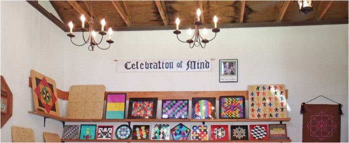 As we like to say as often as possible, Ye Olde Gamery represents the intellectual side of the Renaissance an oasis of thinking, logic, math, geometric tilings, the fun of discovering new ideas and important truths, and the solving of beautiful challenges. All day long, large crowds of visitors engaged in eager play, instructed by the Gamery's well-costumed expert crew. Here are some snapshots of the action inside the Gamery, staffed by our expert crew, some of whom have been helping for over 20 years. We thank them fervently for long participation and friendships. On hand this weekend were Elijah Allen, Thomas Atkinson, Sue Bare, Art Blumberg, Dick Jones, Eileen Shaivitz, Katrina and Hans Weidig, and Steve Zeve. (Hover over images for descriptions.)