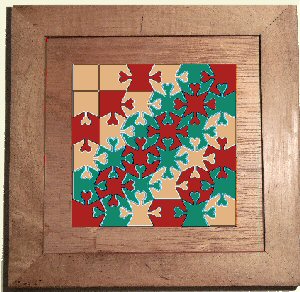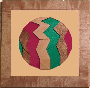 Rombix consists of the 16 tiles formed with four sizes of rhombs, as singles and concave pairs. (See its basic format in the "Essential Polyforms" section.) The 16-sided "circle" hovers like a globe in its expanse of border. This mixed-media version of Alan Schoen's patented concept alternates bands of dark and blond wood and tinted transparent acrylics, in four variations. The felt-backed handcrafted tray has a beautiful maple frame, 12½" square, and a clear cover plate makes it ready to stand on its easel or hang on a wall. Easel included. This set makes a fine gift for executives and math buffs, and is an extraordinary pleasure to play with. |